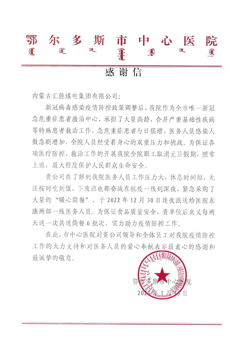 鄂爾多斯市中心醫院 感謝信